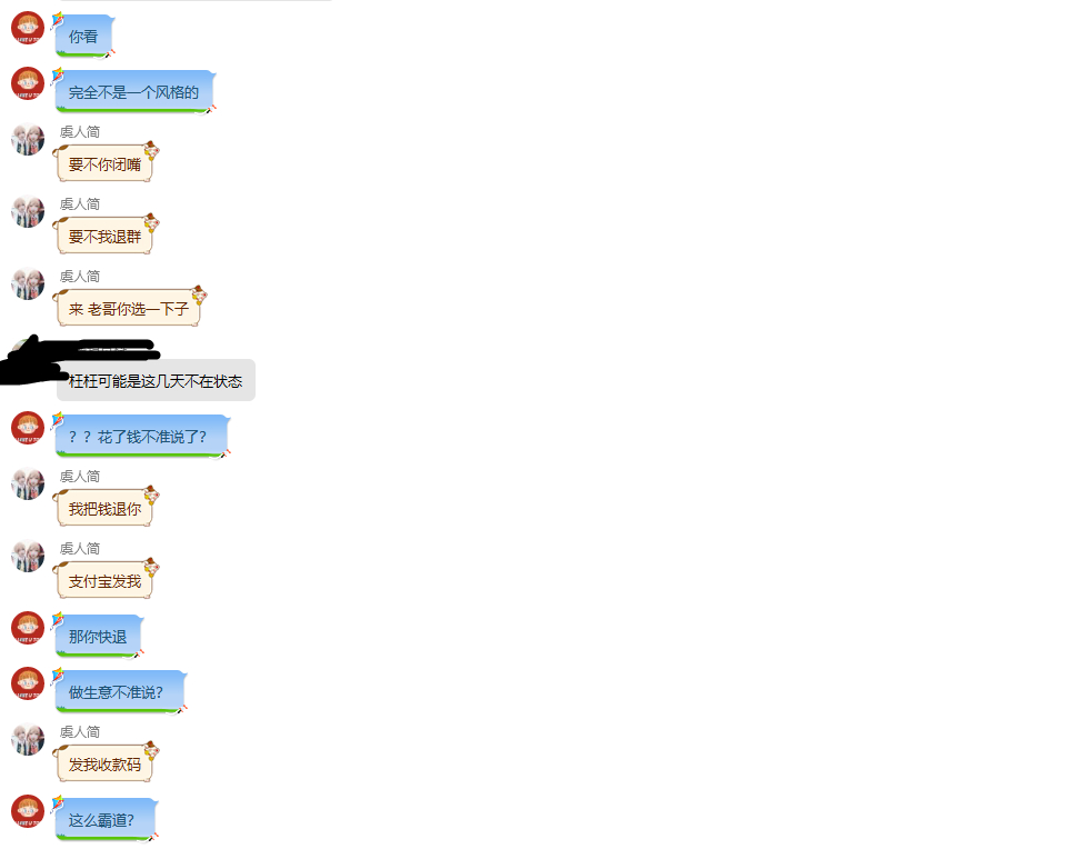 我寻思你这么厉害你群里发红包退我钱不得了?了不起啊?你亲友不能说是吧?我也不挂人家截图君,我就挂这个无脑护的,把你厉害的。我不知道你是哪个服的,我甚至不知道你玩不玩剑三,你这副嘴脸?护犊子这么护的?你要护?好啊?来贴吧护,我就要把截图都放贴吧给大家看看值不值10块钱一张。楼下放截图