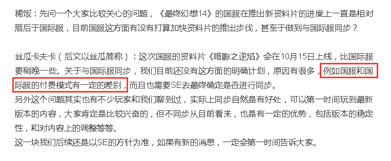常看ff14官方直播的玩家就知道,有期说过这个问题,很大原因就是付费问题,日方答应同步的条件就是国服也实行国际服的收费模式