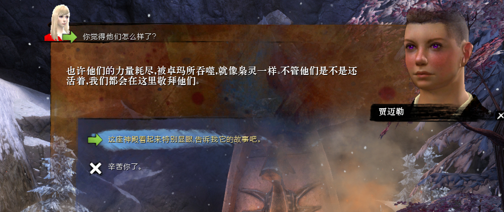 在霍布雷克游览的时候,会有一个探索点,这里单独供奉着三座神殿,分别是牛灵,貂灵和枭灵。与附近的NPC对话,可以得知这是三个失落的野性之灵。在于卓玛的战争之中,牛灵和貂灵失踪了,不知去向,而枭灵则为了保护诺恩南下逃离而被卓玛吞噬,牺牲了。这里的神殿是为他们建立的。