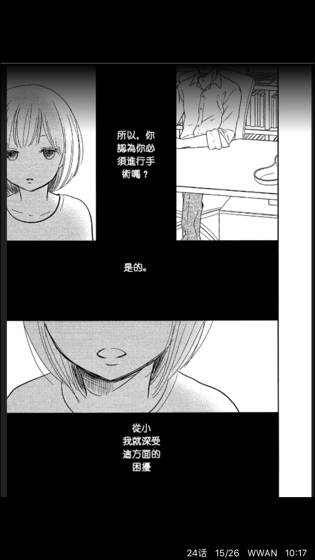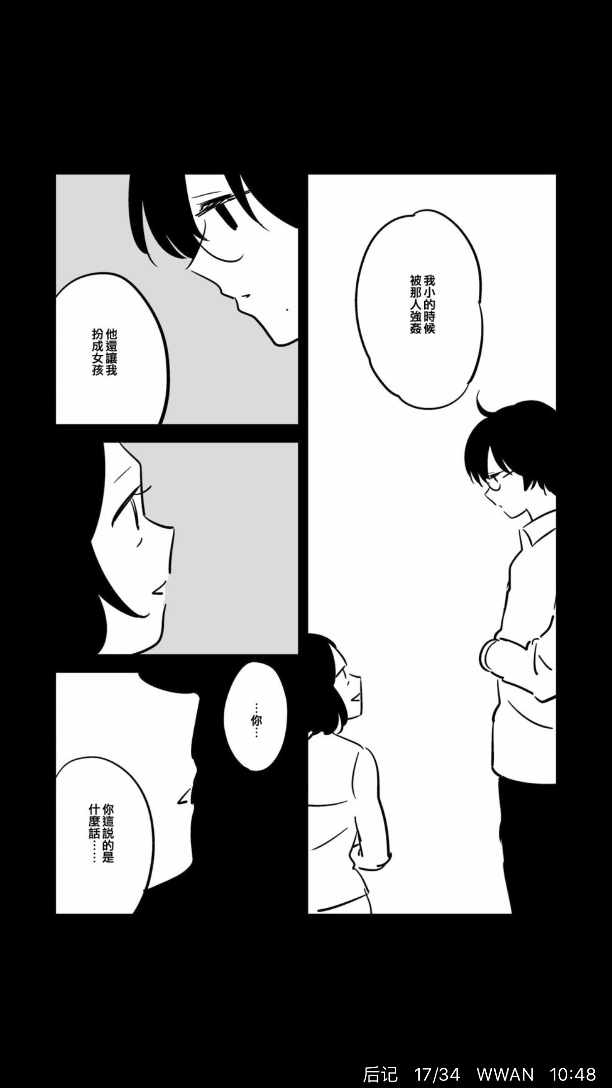 只看开头你会觉得这或许只是一部普通的伪娘漫,随着故事的发展你会发现这三个伪娘居然是三角恋,你或许会感叹贵圈真乱,然而当你看到最后你会发现原来他们几个关系好像也并不如表面上的那么简单,因为其中一个还有性别认知障碍。这个作者描写的跨性别者和伪娘形象十分丰富,心理描写也不错。特别是当主角之一的跨性别者决定要做手术时,当医生对主角说你能被允许手术时,主角的那种感动与喜悦就好像真真切切的传达到了自己一样,真的很为他高兴。另两个伪娘角色,一个和“星期四想与你一起哭泣”男主遭遇差不多,有在看那部漫画的也可以看看这个作者是如何描写这种情况的。而另一个角色,从小就被熟悉的人侵犯,以至于走上不归路。这个角色所希望被拯救的感情,他的无奈给人的感觉都好像是那么的真实,他大概也是这个漫画里唯一,直到最后也没有任何希望的角色吧。相信看了这部漫画后一定会有人和我一样非常有感触,如果看完感兴趣的可以试试这个作者的其他作品,也是很不错的。