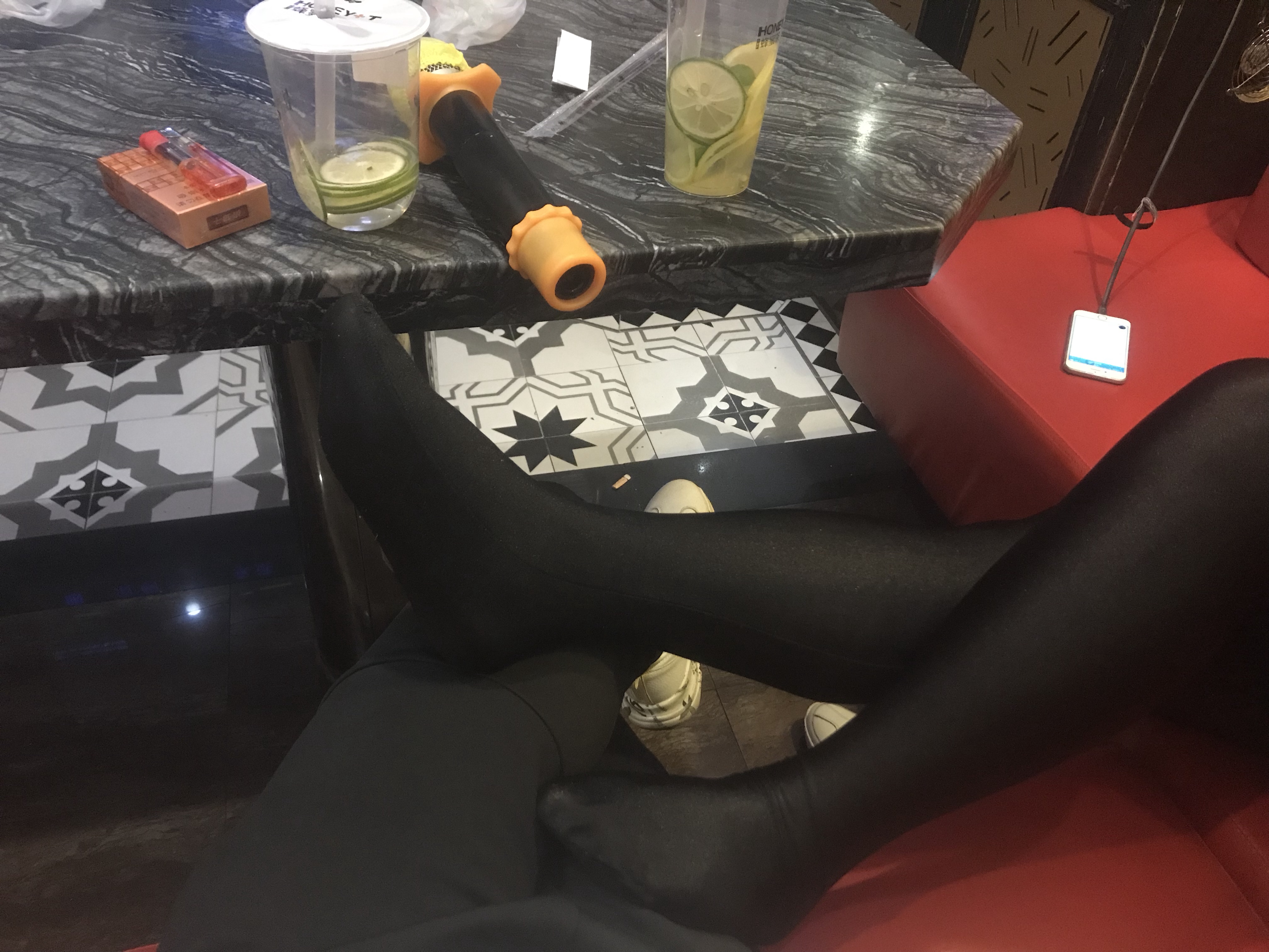 公司聚会,喝完了,现在在KTV,设计部的妹子居然把靴子脱了,