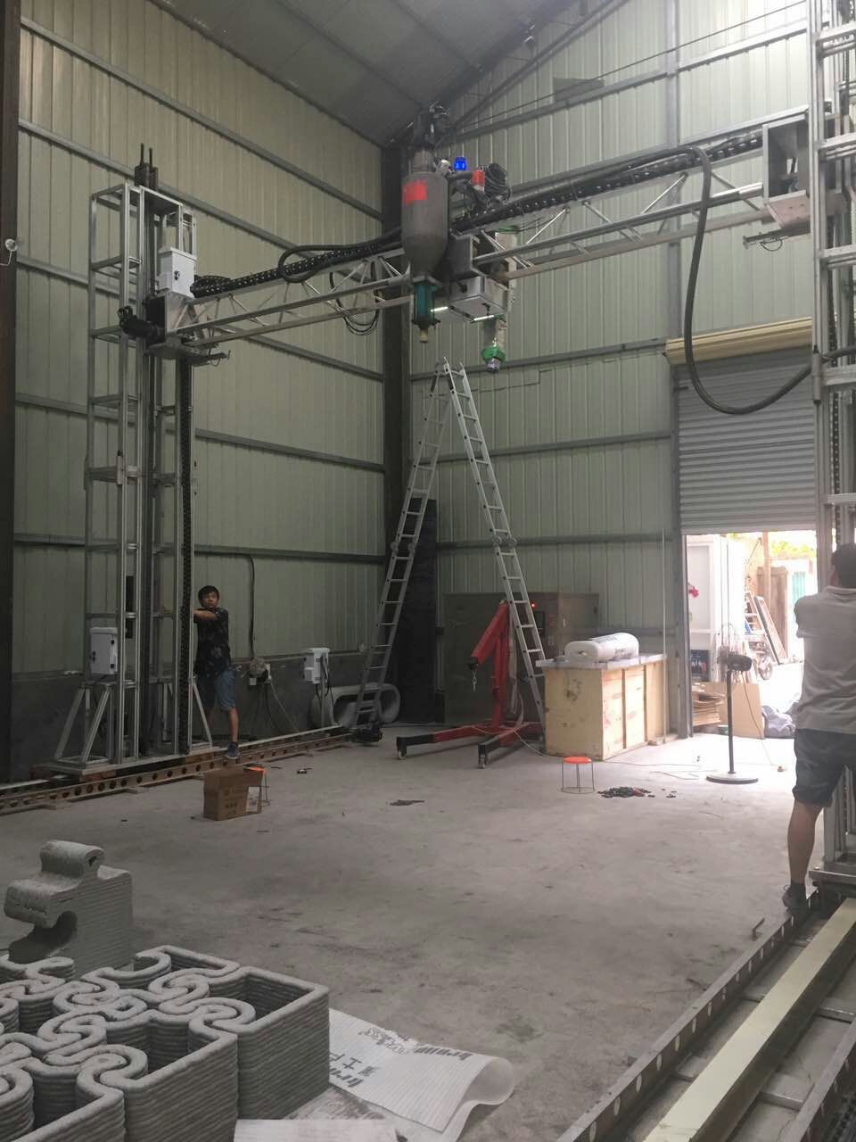 打印设备本次打印桥所使用的就是下面这台建筑打印机,拥有巨大的体型和喷头,将水泥源源不断的通过喷头挤出,构建建筑体。这个打印设备尺寸是10米*5米*5米,是太空灰实验机。太空灰团队设计的设备最大尺寸是50米*15米*15米,可以根据客户需求进行定制。真正应用于市场的设备和现在的实验样机相比,外观和功能都有很大程度的改变。