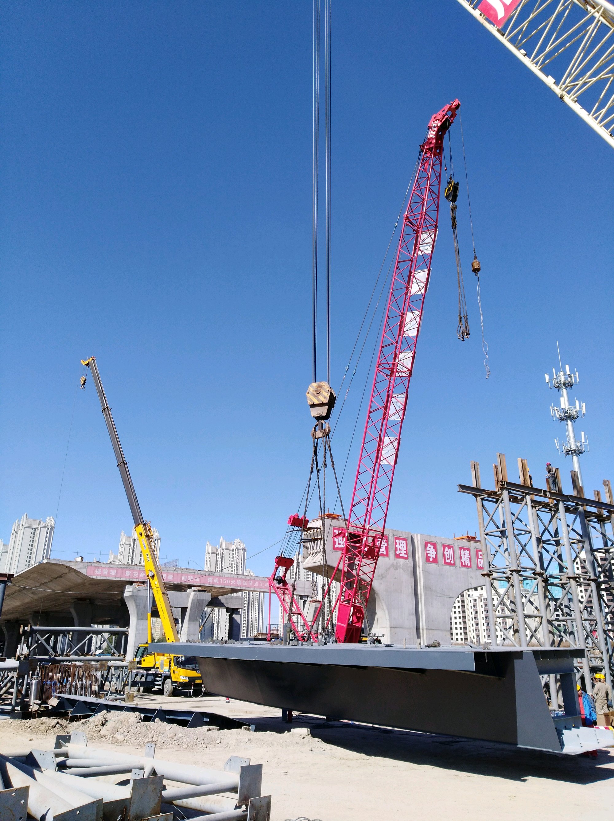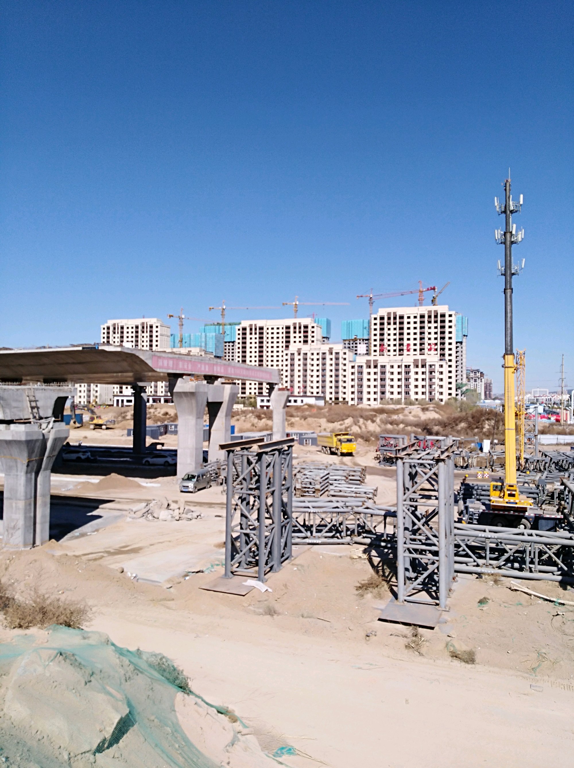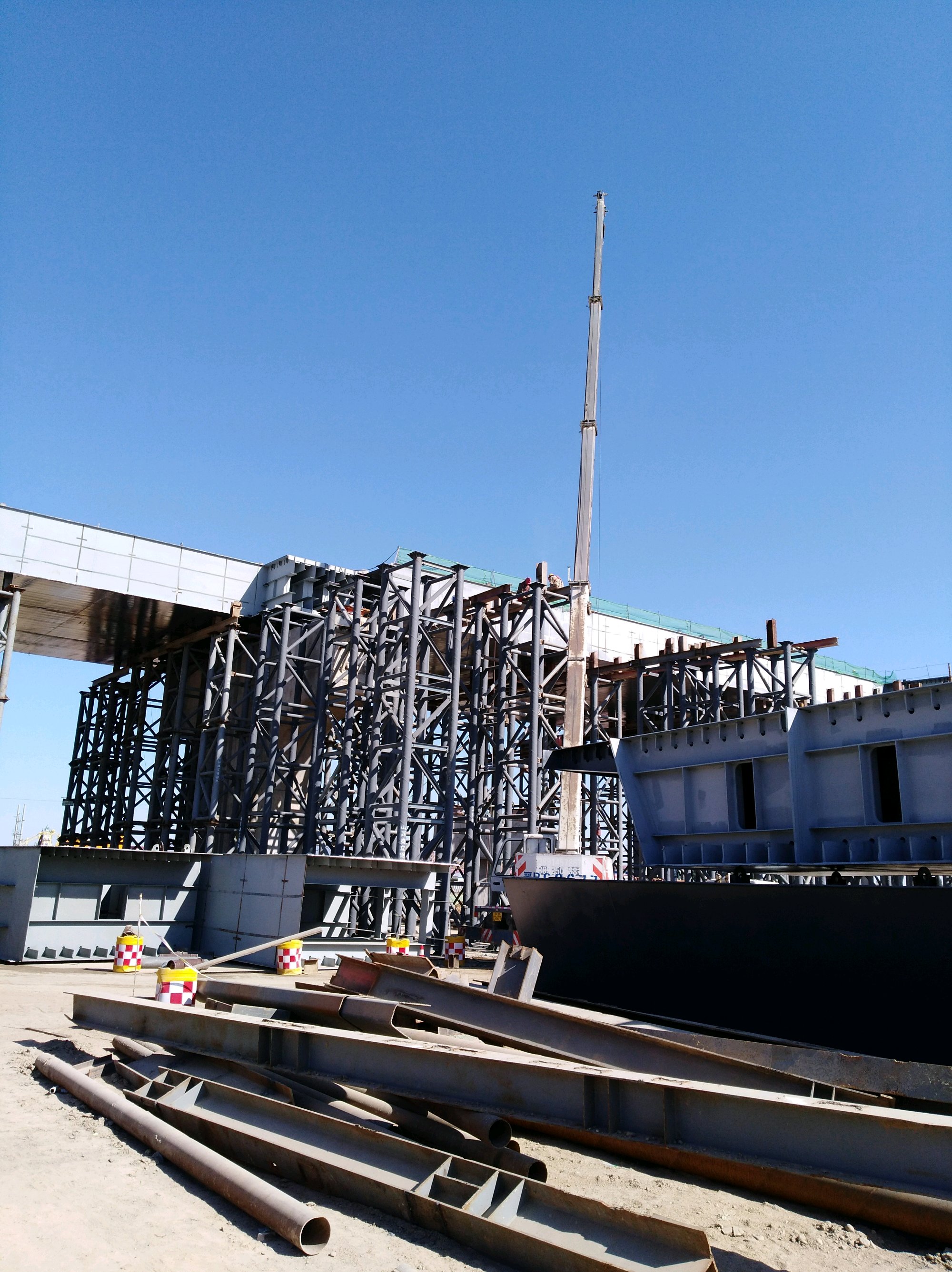 这里是高铁站前高架路工程比较复杂的关键部位之一,看来要采用较多的钢制箱梁。但是钢箱梁组装完毕之后,还需要铺设桥面,对环境温度仍然有一定的要求。所以这个过程还必须继续抓紧。