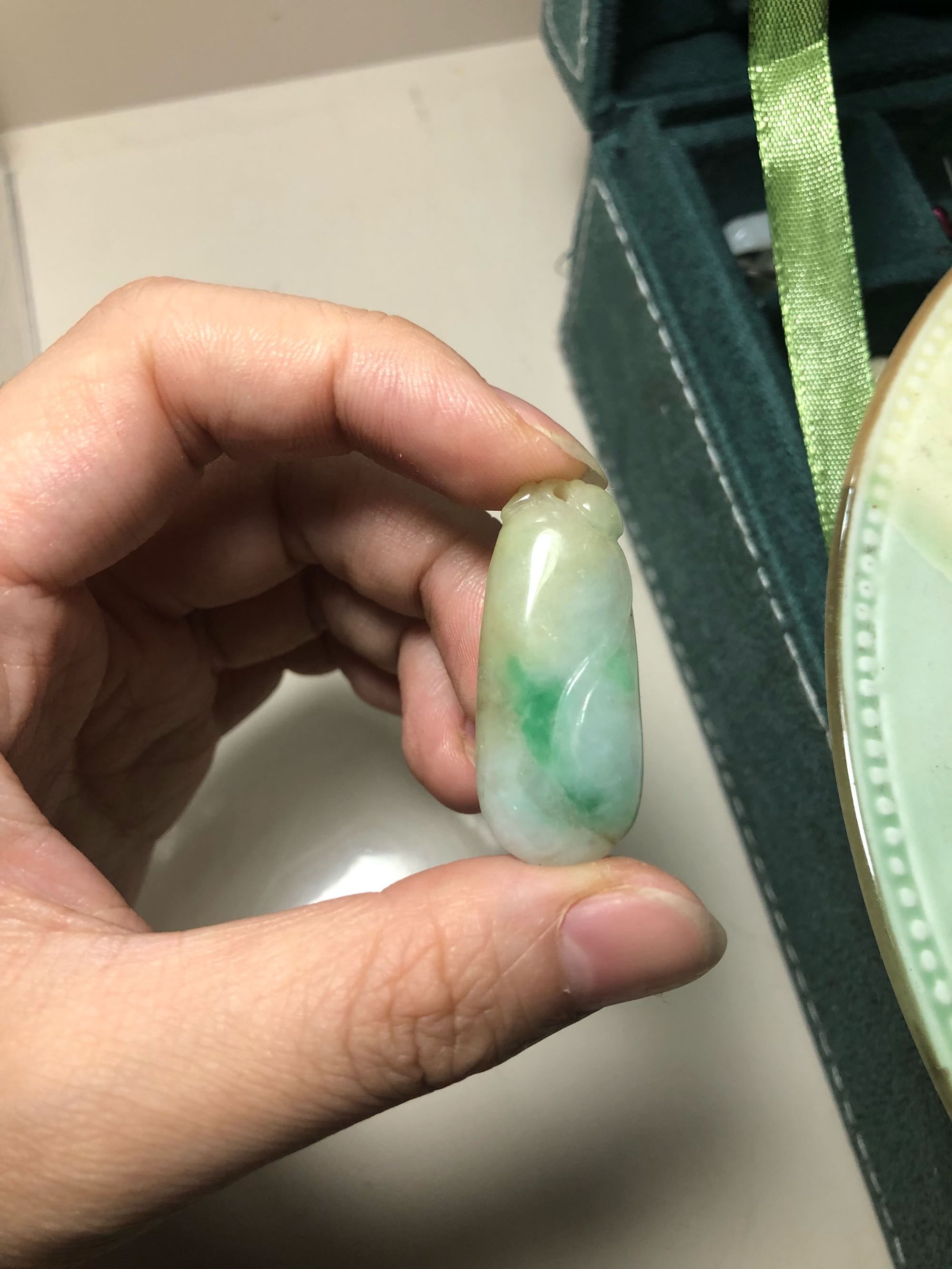 有一抹绿的翠翠坠子,底部避裂雕。