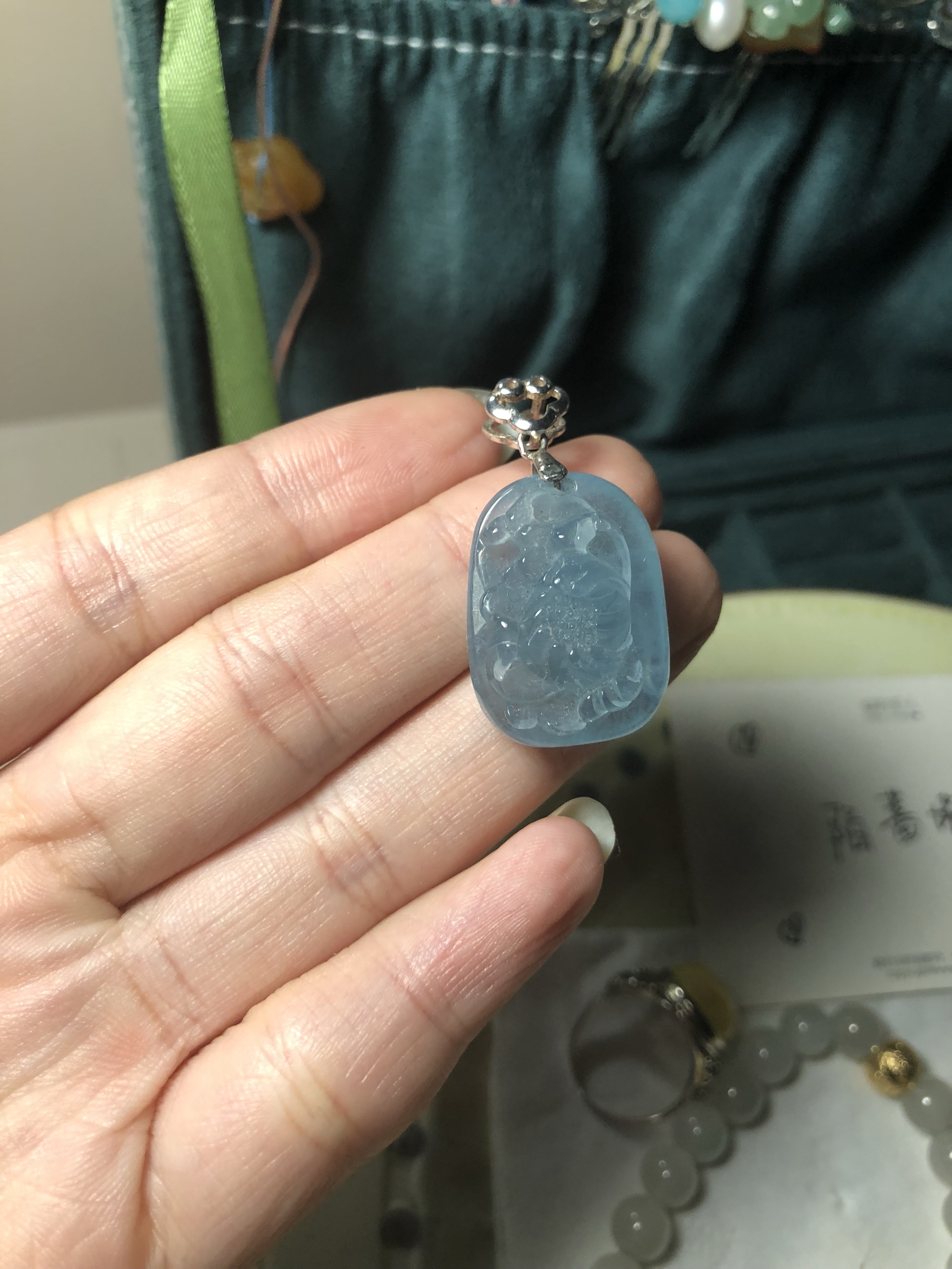 海蓝宝坠子,雕刻挺好的,有层次。