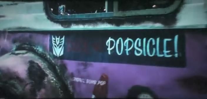 在电影的原著小说里这条贴纸上写的是Decepticons Lick My Popsicle,意思是“霸天虎们,来舔我的冰棒吧!”可能为了体现这辆冰激凌车真的很老掉牙,就把lick my两个字褪色了,仅供参考,谢谢!