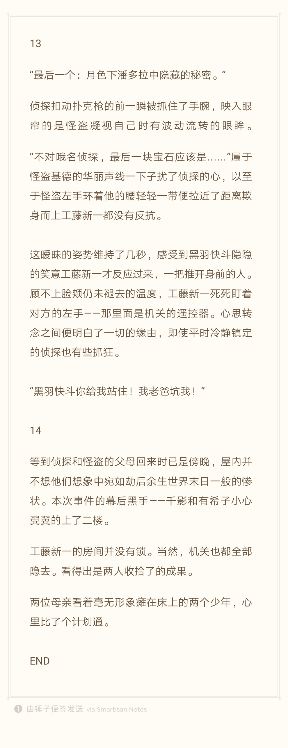 “关于这个,老实说......”黑羽快斗觉得还可以拯救一下,却被侦探无情打断。“『老实说』这个词不太适合你吧小偷先生,而且一般这个词接下来的话都不怎么可信。”