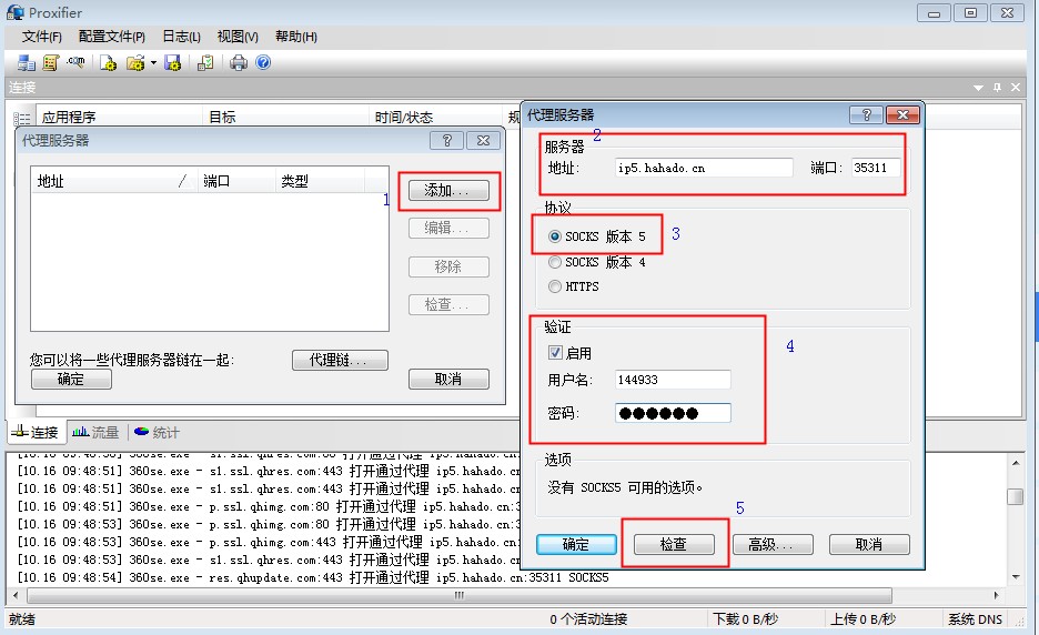 第三步点击添加 填写服务器地址 端口 协议勾选s5 填写用户名密码 点击检查