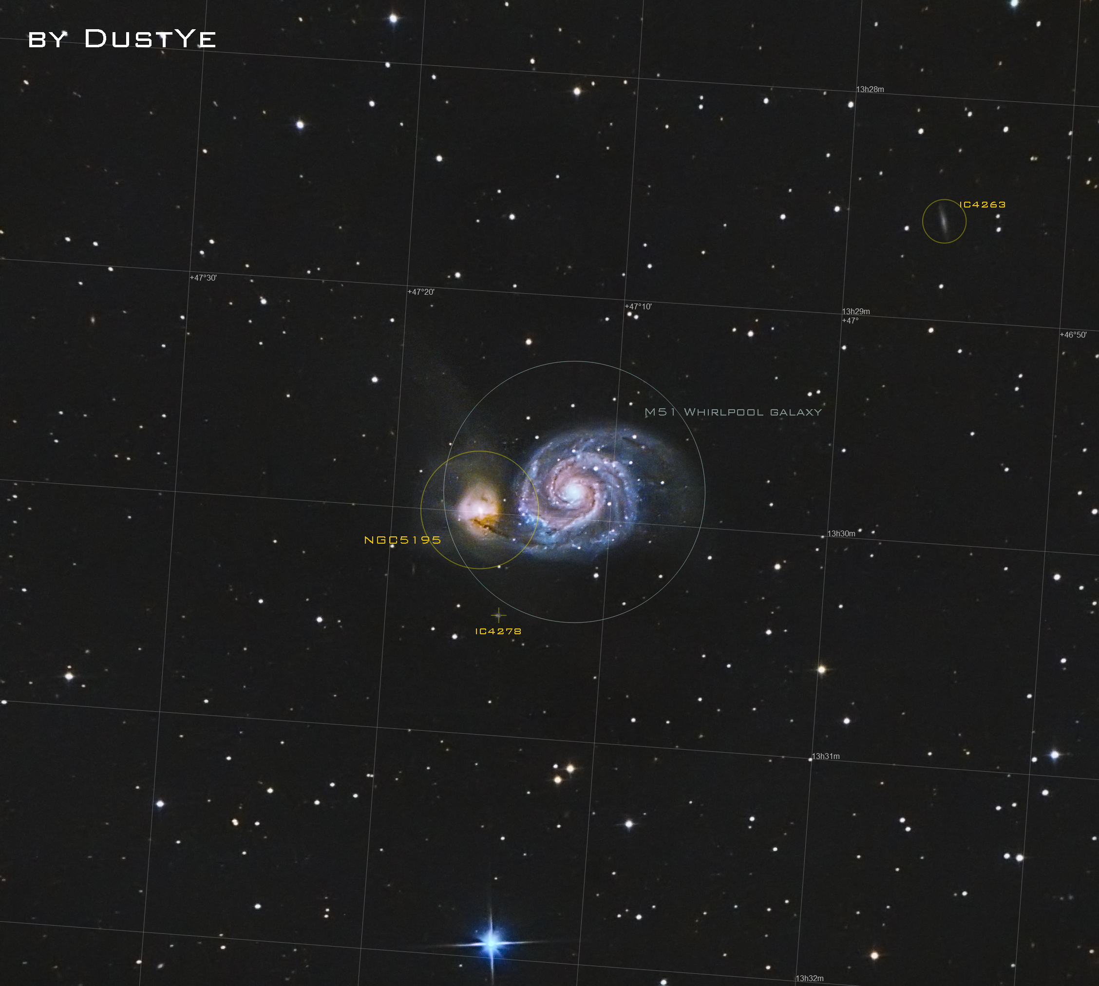梅西耶天体51号,由查尔斯·梅西耶于1773年10月13日首次发现(差3天赶上小蜗牛的发现246周年纪念日),是位于北天的一个庞大的螺旋星系,距离地球大约2300万光年。