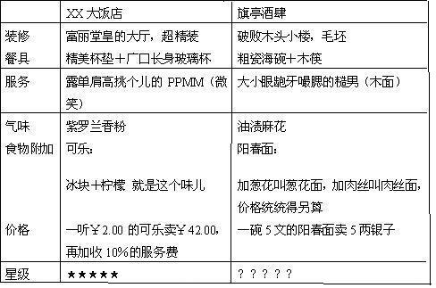 无庸置疑,从价格来看,他们都是奸商。但显而易见的是,同样是对顾客的抢劫,XX大饭店显然要隐蔽的多,技术高超的多,自然也就显得理直气壮的多,文明现代的多,身份尊贵的多。顾客即使多花冤枉钱,也会生出一股子莫名其妙的虚荣感。而高鸡血则太直白,太原始,于是就显得无理,野蛮,以及低级趣味。