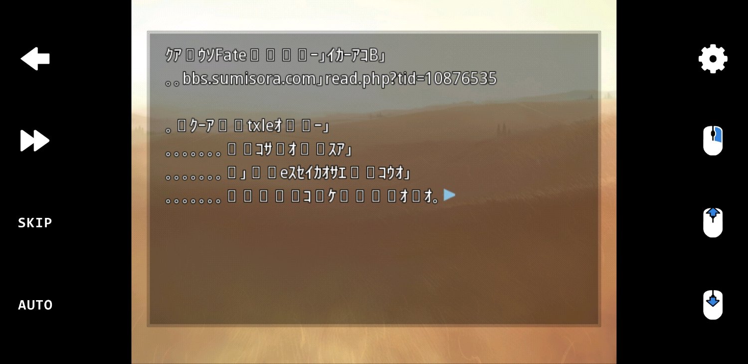 Fate的ons模拟器打开后可以正常运行,有声音但是文字显示乱码,,或者说是日文不能显示?但是在电脑上打开里面的TXT文件能看到汉字的选项