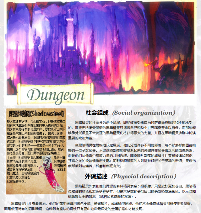 描述黑暗精灵是森林精灵(Sylvan)中的叛逃者,在很早以前他们就与神秘的无面者(Faceless)达成了协议。他们拥抱黑暗,选择生活在亚山的地底世界,在无数的洞穴中建立自己的城市。