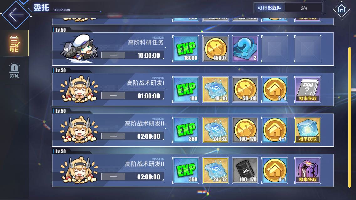每天晚上0点后,就会刷出这种等级委托,这种委托时间短,收获高,不过有数量限制,做完8个就没了(好像是8个)。