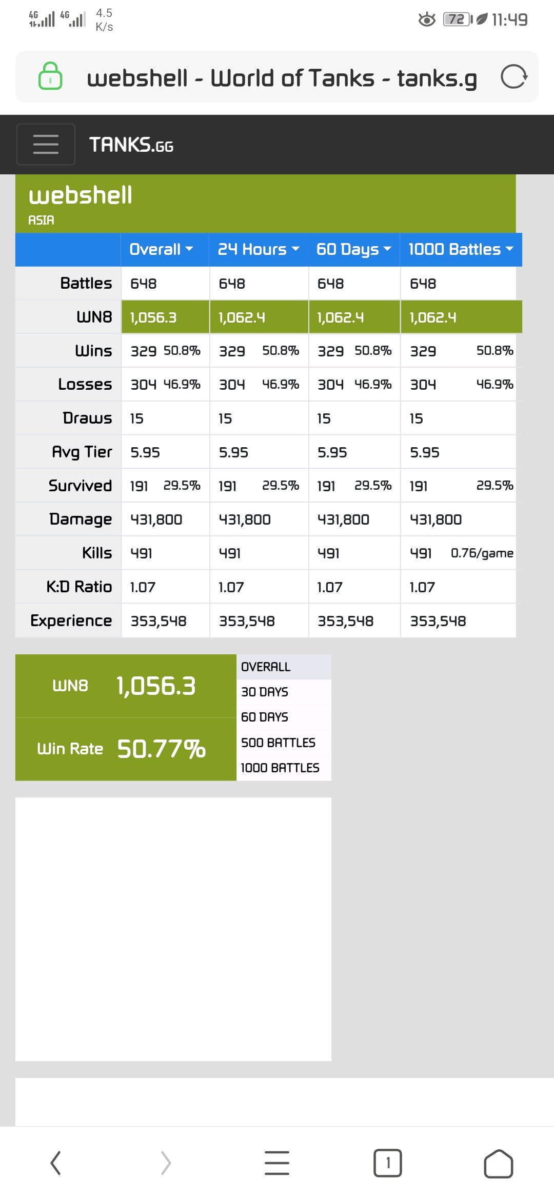 这个网站上可以查到整体玩家的水平,亚服的平均WN8是1237,胜率50%。