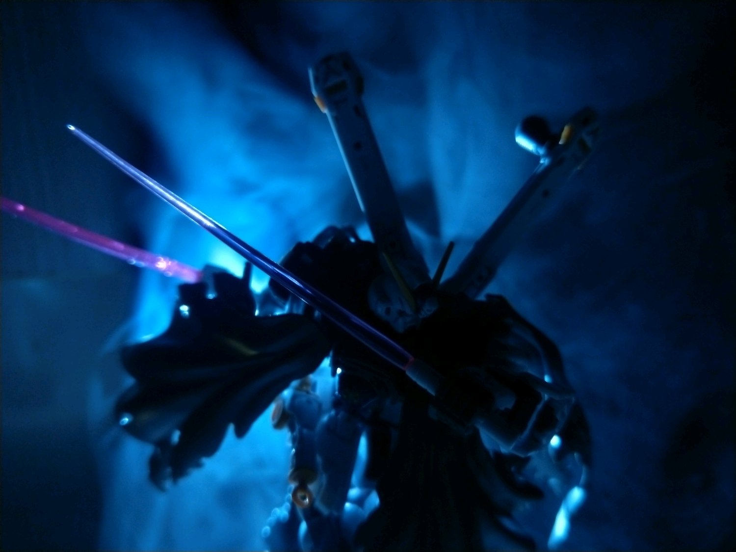 就是利用一个点光源 可以是手机的手电筒 也可以是那种USB灯作为主光源 模型放在光源前面 然后烟雾部分 我是直接抽烟喷出来 也可以用加湿器 香 都可以 然后手机直接拍 调成专业模式 白平衡2200 拍摄延迟1/15s 感光400 挺简单吧
