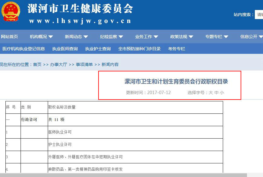 2016年4月,市民徐先生举报漯河市中心医院医生李琳无处方权滥用抗菌药物--替加环素导致患者死亡。漯河市卫计委先是称和漯河市中心医院是平级单位管不了,后在省卫计委责令下又以没有职权处理违规医生为由推诿。为此,徐先生2018年5月申请漯河市卫计委公开《漯河市卫计委行政职权目录》(参见下图,该行政职权目录第61-63条规定,卫计委对违规滥用药物的医院和医生应当予以处罚)。但是漯河市卫计委以漯河市编委《漯河市卫计委主要职责和内设机构和人员编制规定的通知》冒充《漯河市卫计委行政职权目录》调戏当事人。就好比群众想知道漯河卫计委领导的亲爹是谁,它说他叔就是。领导,你以为花椒了群众,很爽!但是你让你妈情何以堪?