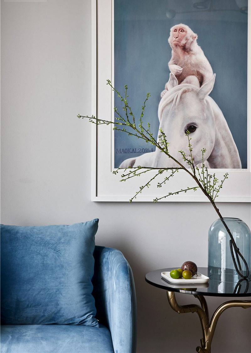宽敞通透的客厅区域,用水墨蓝作为背景色系,让人沉静在轻松的氛围当中。雾霾蓝转角沙发,搭配米色单椅,清爽大气。精致的家具与陈设提升家里的品质感,舒服的色系搭配增添温馨感。