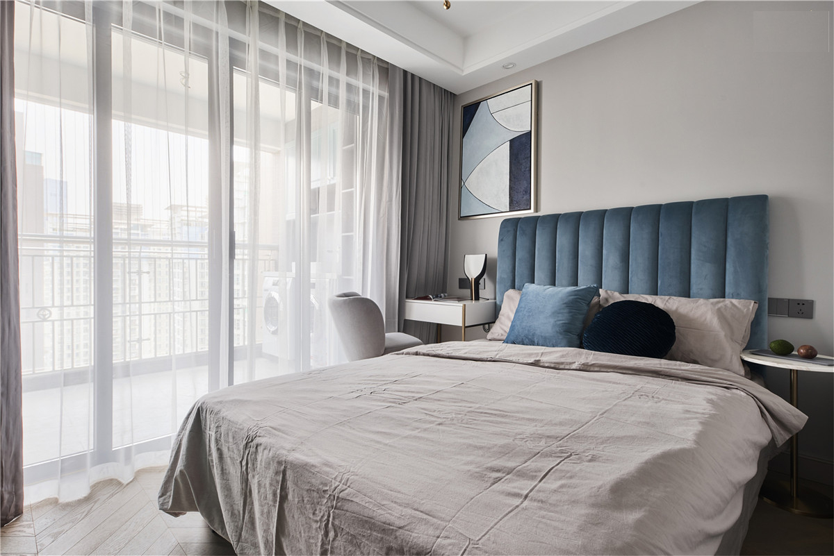 朝南的小房间是次卧,米灰色主色调,点缀雾霾蓝,耐看而不失个性。适应小空间选择了小巧精致的活动家具,不仅满足使用的功能,同时兼具时尚与美观。