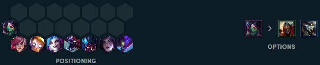 这个阵容的基础站位跟大多数的刺客类型的阵容是非常类似的,这个阵容里如果拿不到四费卡的阿卡丽是可以利用劫、狮子狗这样的牌进行替换的,不要纠结于同一张的key卡。