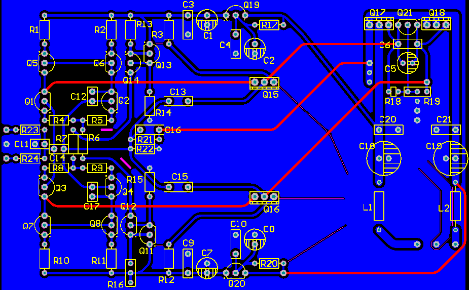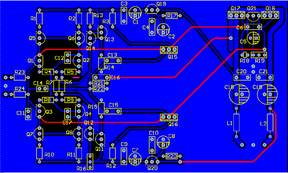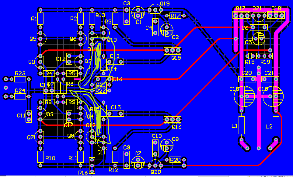 对称双差分,要求走线尽量对称,但是功率管要装散热器只能偏到一边,不对称了,不爽。