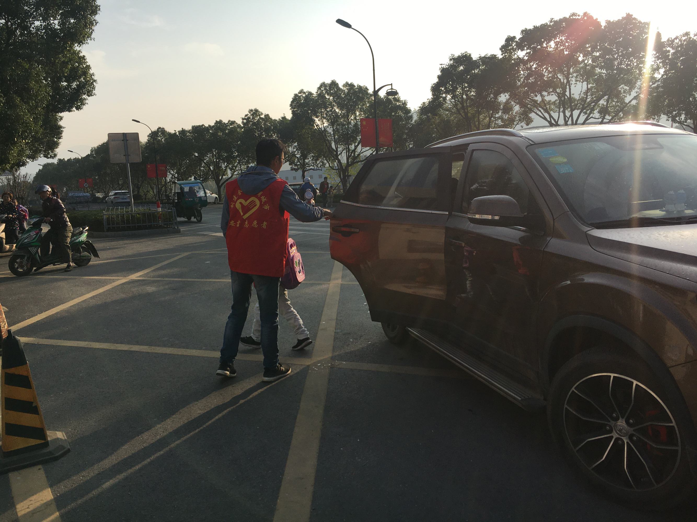 妈妈们穿梭在来来往往的车辆中,为上下学的孩子打开车门。