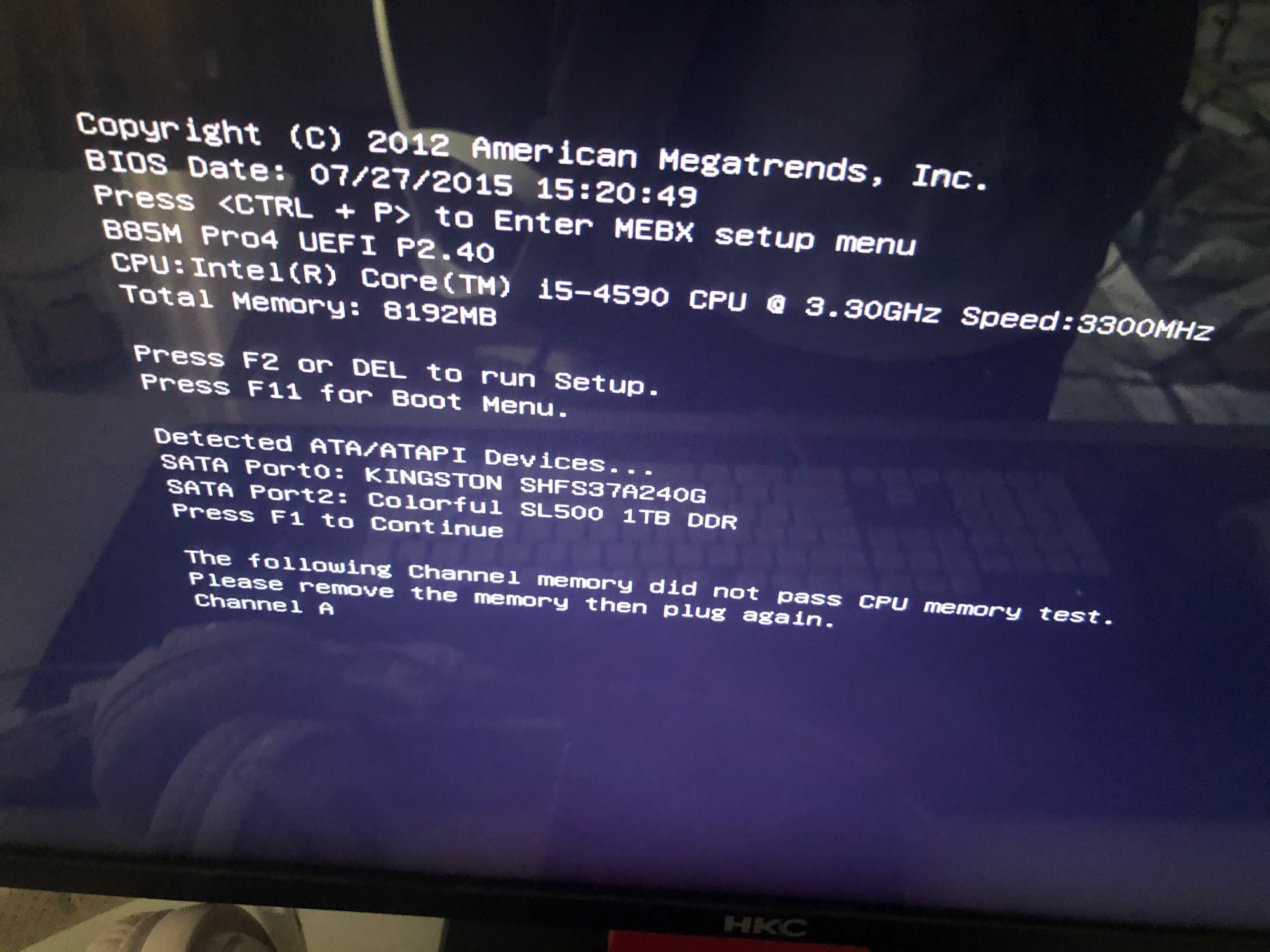 这不写的很清楚么,内存问题。让你拔掉内存在试一下,双通道就把靠近CPU这条拔了
