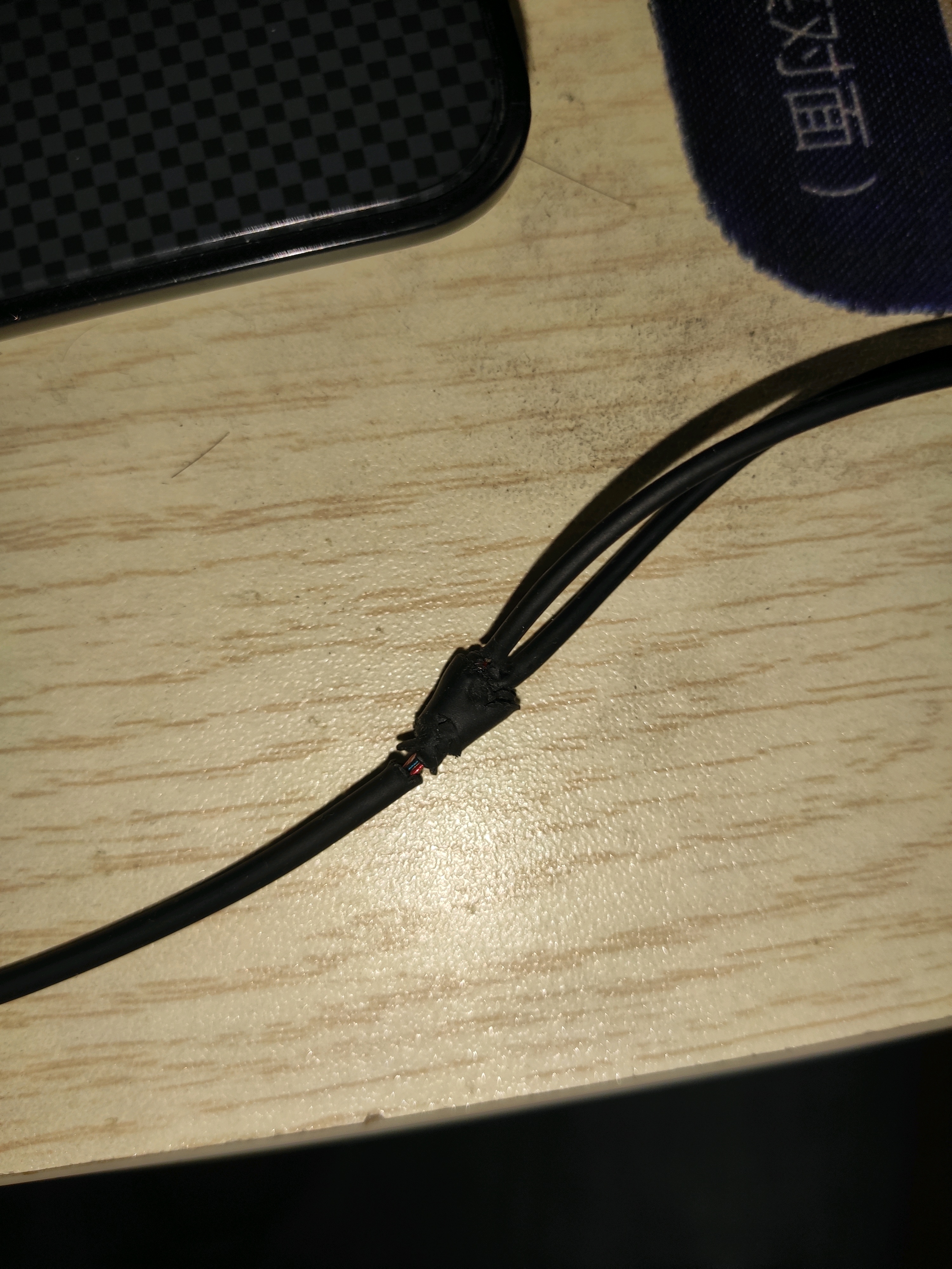 看到这线成了这样,吓我一跳,掏出来耳机看看线,发现分叉的地方是合金材质的,然后麻花线看着就结实,嘿嘿