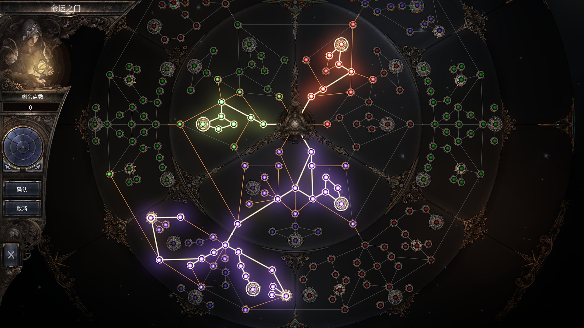 走的技能是法系增强护盾那个技能,攻击吸血变成吸护盾,异常状态先伤护盾那条线,战系是那个血量到多少就自动回血,绿色是受到攻击闪避。总之都是提升生存能力的线路。
