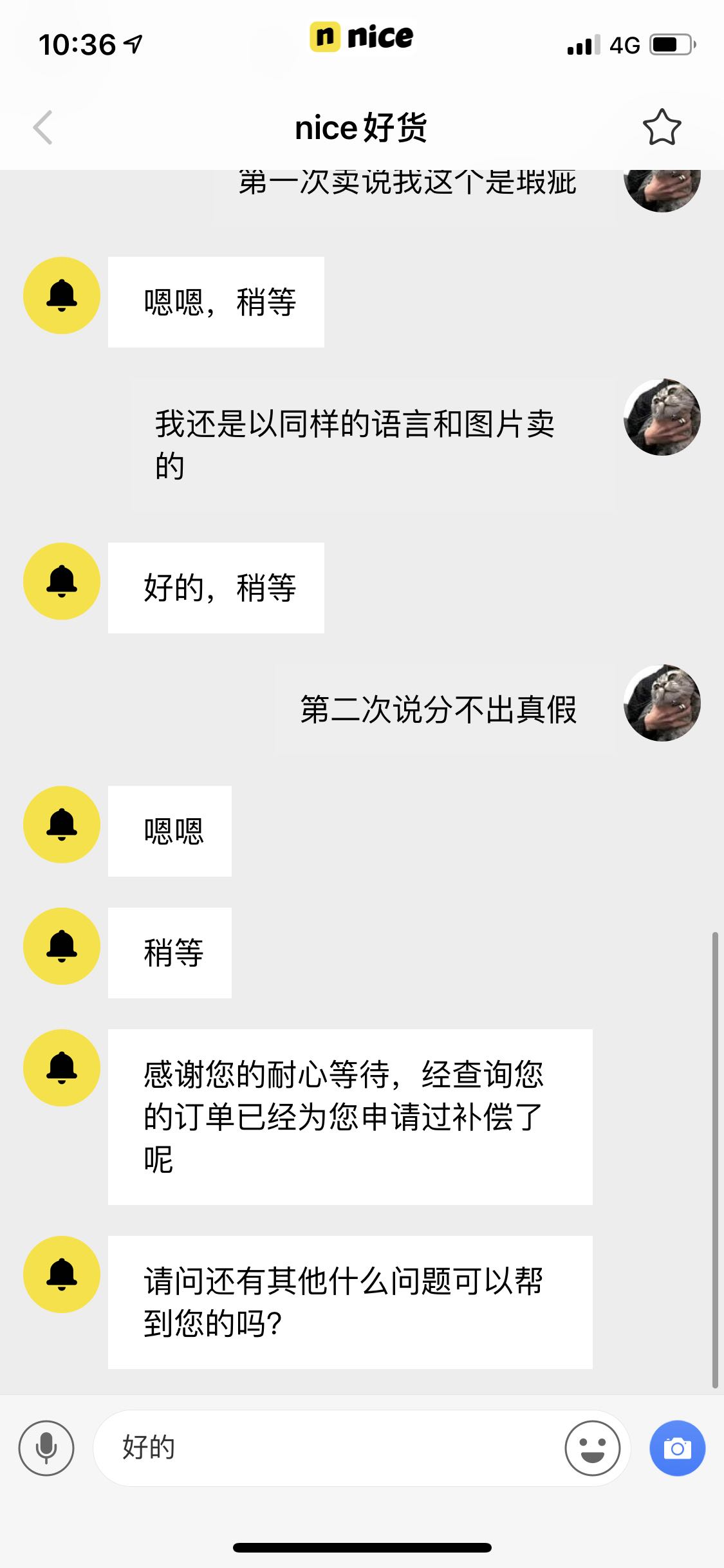 在第一次出售的时候,我是以同样的图片和文字进行转卖(当时这鞋涨价了),但到了nice查验时,却被告知鞋子有褶皱瑕疵,这点我跟nice扯皮半个月,nice客服就是大爷,专员也是大爷,搭理都不爱搭理我,不了了之,然后我就想加上瑕疵,自己亏点出了,就有了第二次出售订单,这次nice查验出的结果是“查验未通过”,他们的言外之意就是想说这可能是双假鞋,继续找客服处理,第一个客服我逼他帮我找了专员处理,他也信誓旦旦的说帮我找了专员~ 有趣的事情又发生了,过了7天左右,我就纳闷了,专员为什么还不找我....我就去问了客服,他说我这个订单号根本就没有专员处理....这就是nice的服务态度,这就是nice的平台理念,这就是nice的诚信,希望各位新手引以为鉴,我鞋子打算不要了,吃亏就吃亏了,附上我的买卖和跟客服的聊天截图