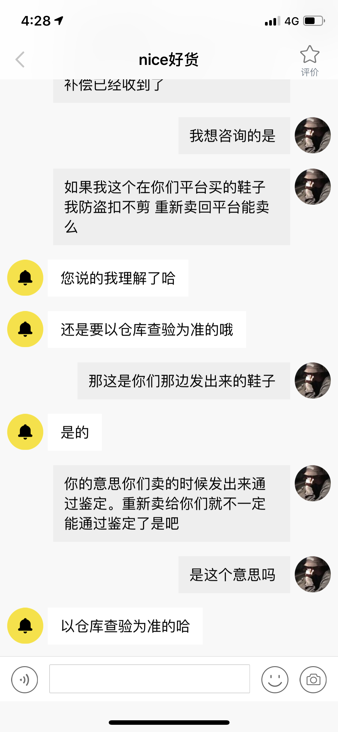 nice真厉害 瑕疵的鞋子过鉴定发出来后不管不问了 到最后说能不能卖回平台的时候 客服的回答我笑了 发出来的时候能过鉴定的 卖回去就过不了了? 自己打自己脸么