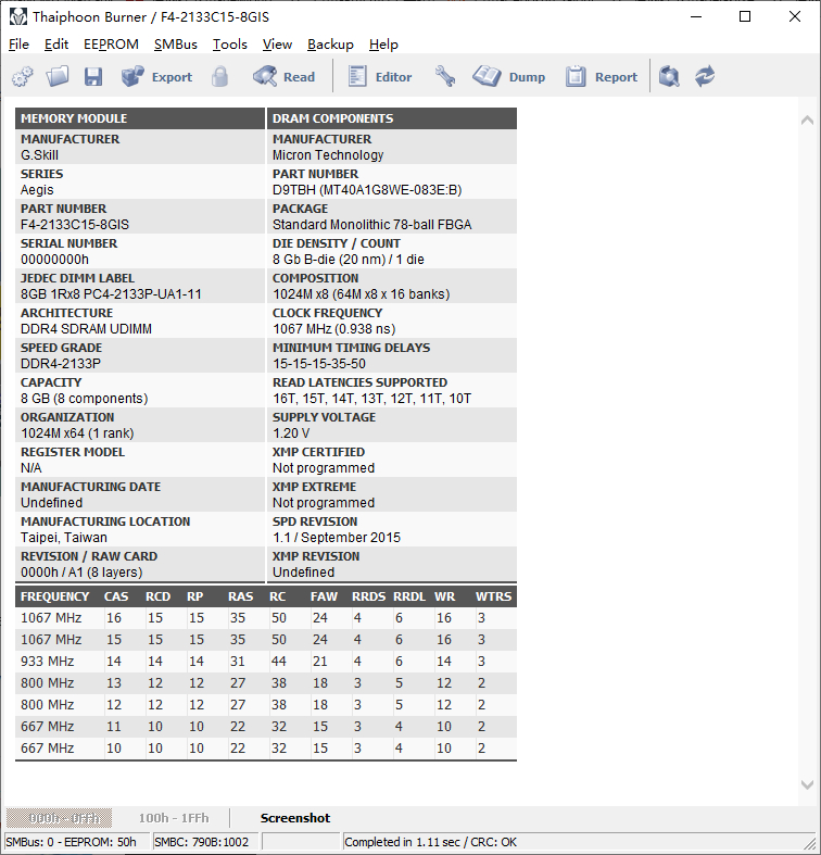 16年买的芝奇 ddr4 2133 8 g.。时序:CL15-15-15最近装新机用上了/感觉频率有点低,才知道这东西可以超,台风参数如下: