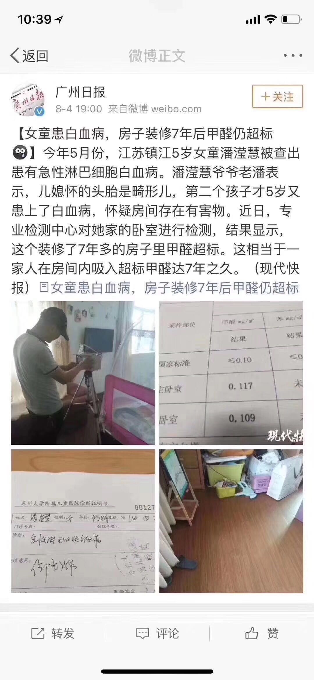 装修七年的房子!甲醛超标!一般患白血病人都是在甲醛超标中,可见光通通风什么的,不能解决根本问题,不能轻视甲醛,苯系物等有害气体的存在,下图才超标了一点点,都会对人体造成那么大的危害。关爱家人健康,预防远远大于治疗。泸州除甲醛,就找四川聚义环保有限责任公司专业除甲醛。联系电话: