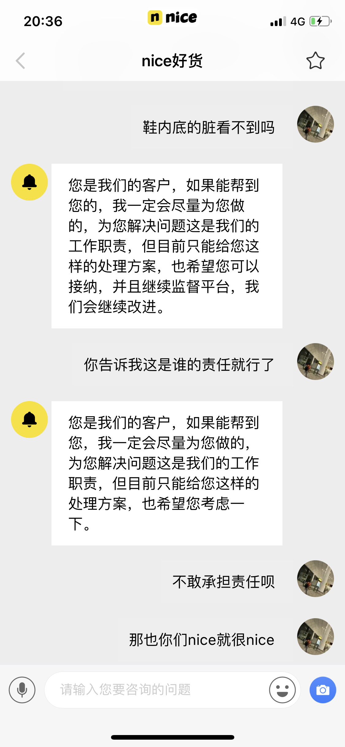 随后nice的态度,为了几十句这是谁的责任,不敢回复,30.50打发人?? 要我消费者承担一切不属于我的责任。