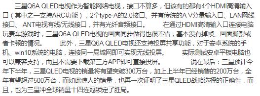 不仅有简约的显示时间日期的信息模式,并且环境屏同样支持亮度自动调节,还可设定休眠时间。 好玩是一方面,环境屏也有实用的一方面,那就是在使用环境屏的情况下,电视机实际上是以低功耗运行的,并不是完全的待机。所以其AI语音助手功能通过遥控器可以轻松唤醒。出行查询天气路况,帮给孩子解答百科问题,点播歌曲视频等等,只要是三星手机Bibxy能做到的,三星电视的Bibxy一样可以。并且还支持IoT物联网功能,支持作为控制中心语音控制支持samsung connect的智能冰箱、洗衣机、空调、扫地机器人、智能音箱等设备。 4、内置资源丰富吗? 三星Q6A QLED电视作为智能网络电视,搭载了三星Quantum Processor 4K AI功能四核处理器,并配备了2.5GB RAM+8GB ROM,支持WAN有线和WiFi无线联网。APPs应用商城的资源没有手机丰富,但在电视机产品中也算出类拔萃,完美支持芒果tv、银河奇异果、极光TV、CIBN酷喵影视等高热度视频APP,并且有大量定制化的免费资源可以在线观看。 当然也可以共用手机的VIP账户,在线观看收费节目。 此外,三星Q6A QLED电视还支持电竞、儿童、健身、读书、游戏等多种主题的热门应用。燃脂健身可以注册购买Fit课程,在电视机上观看教学片和跟着做运动比小屏幕的手机更有氛围感。 其内置的有书APP,有好多热门书籍的可以听、热门课程可以看,闲暇之余带着孩子听朗诵、看名家讲解也比在网上乱找资源更省时间。 更别说其内置星歌APP,支持在线K歌,如果再置办一套5.1声道的家庭影院音响系统,估计家里都要秒变KTV了。 而且还不用单独购置无线话筒,三星Q6A QLED电视的遥控器直接就可以当话筒使用,话筒拾音效果也还不错;选择自己喜欢的歌曲,想唱就唱。 5、接口扩展是否便捷?