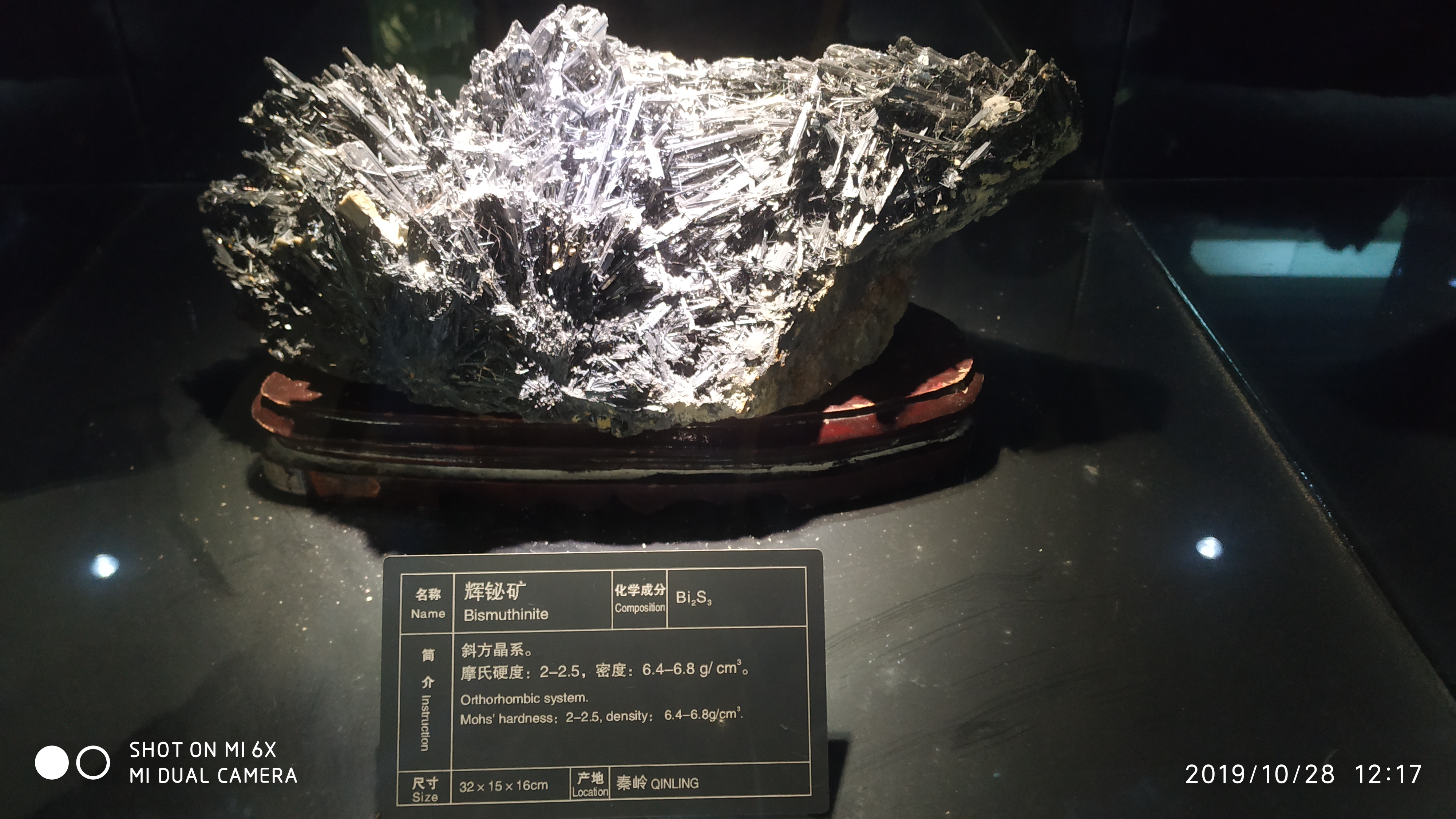 辉铋矿是硫化物矿物,其中铋含量为81.3%,是提炼铋的最主要矿物原料。辉铋矿具有金属光泽,灰白锡色,晶体为长柱或针状,许多这样的晶体聚集在一起呈放射的柱状或粒状。辉铋矿分布非常广,但有开采价值的大矿床却非常少,一般都混在其他金属矿床中。化学组成:Bi2S3,Bi铋81.3%,S硫18.7%;类质同象混入物有Pb、Cu、Sb、Fe