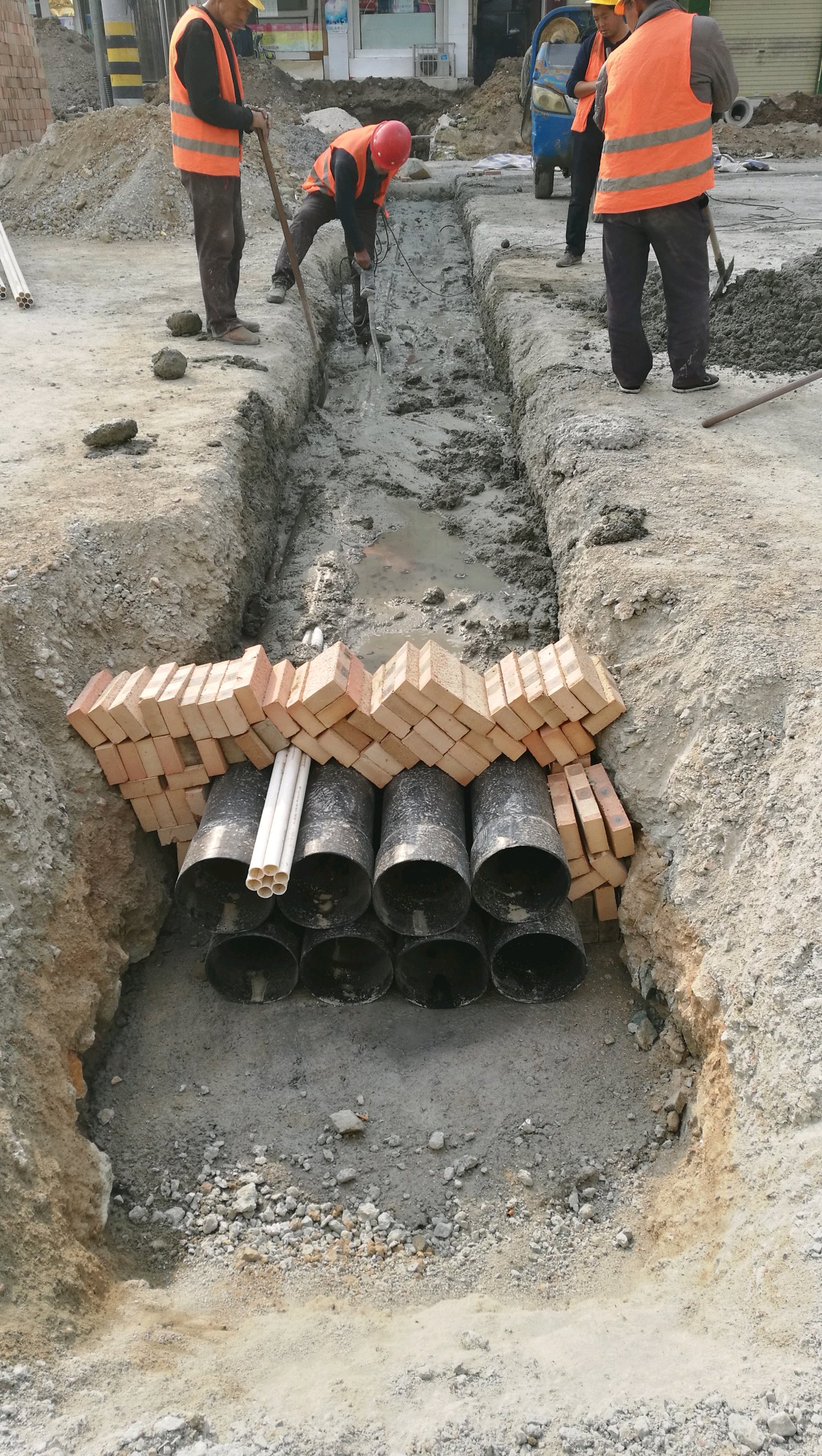 解放路禹都大道街口施工偷工减料,两层排管一次铺设,一次水泥夯实。工程施工中管道敷设不允许用水泥直接操作。