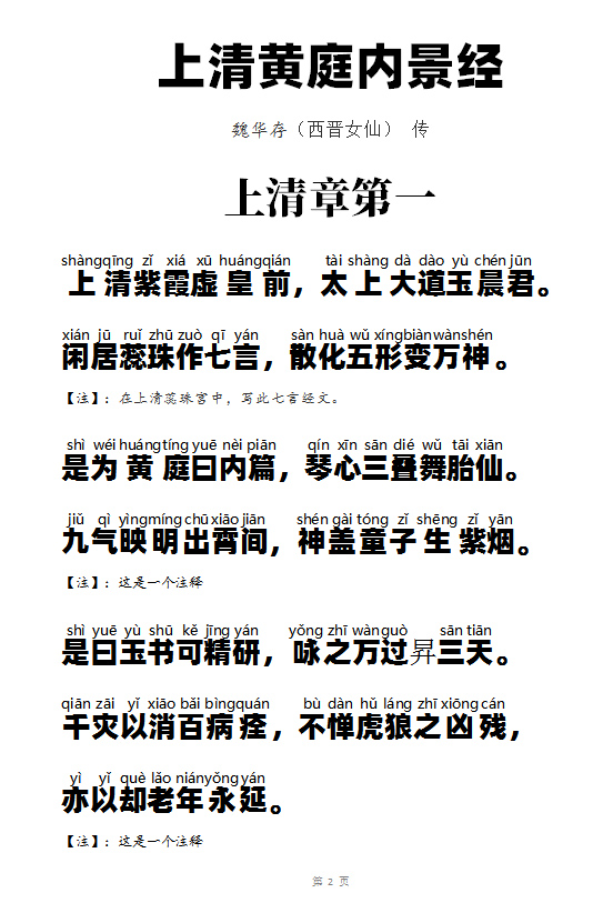 为了方便老人们学习黄庭经,我准备编一本大字版的,拼音的《黄庭经》,带注释的,大约样子如下图。欢迎对黄庭经有研究的任何道友一起来编辑和出力。