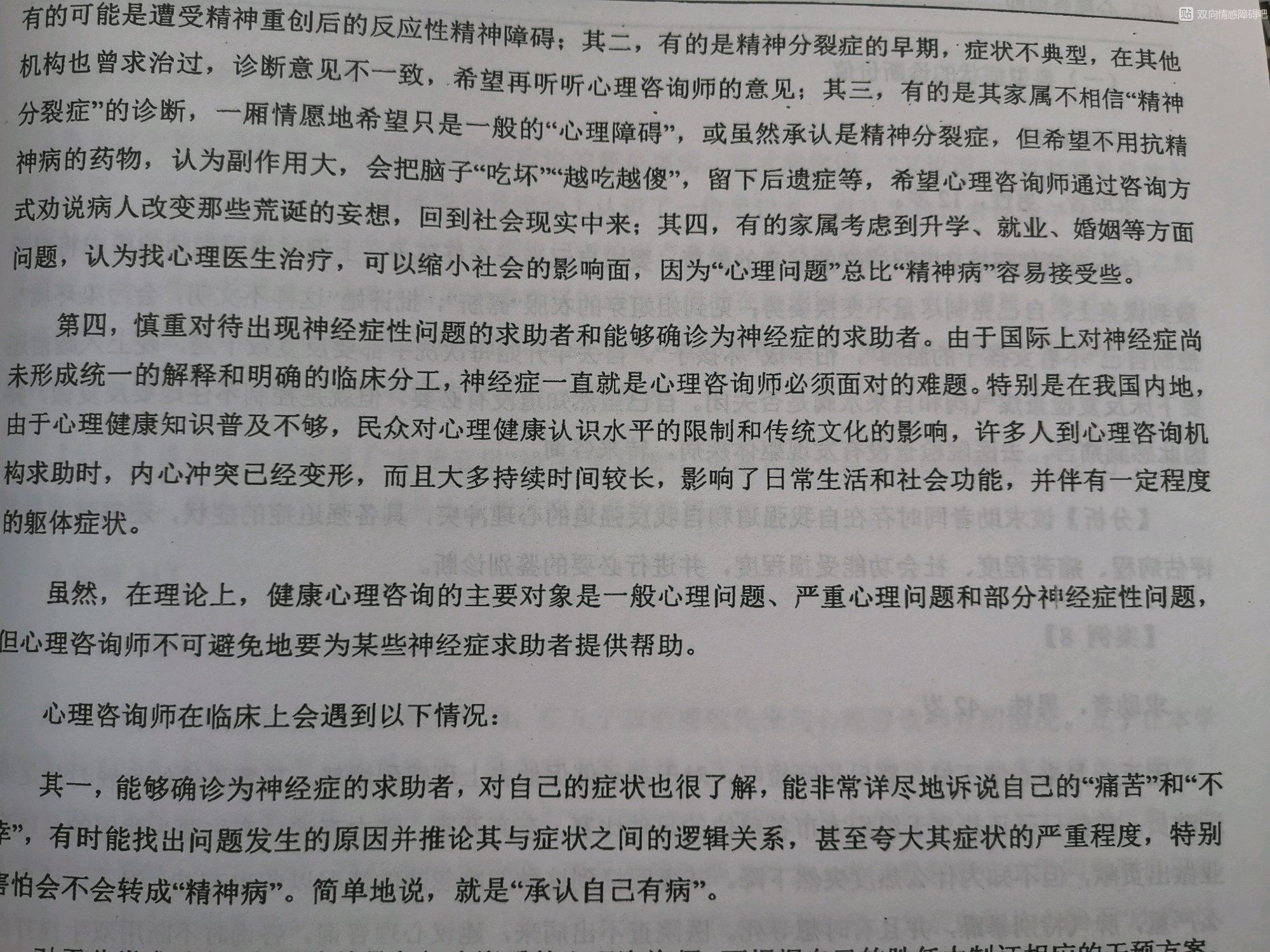 我们个别吧友,坚持认为心理咨询时有效的, 认为自己的精神病就是咨询师调理好的。 那么在这里我恭喜你,你可能是被误诊了, 你不属于精神障碍的范畴,而属于非病理性心理问题的范畴。对于这样具有热心的吧友, 我建议你应该去心理问题的贴吧介绍经验, 在这里介绍你的经验可能会误导一些不知情的吧友。
