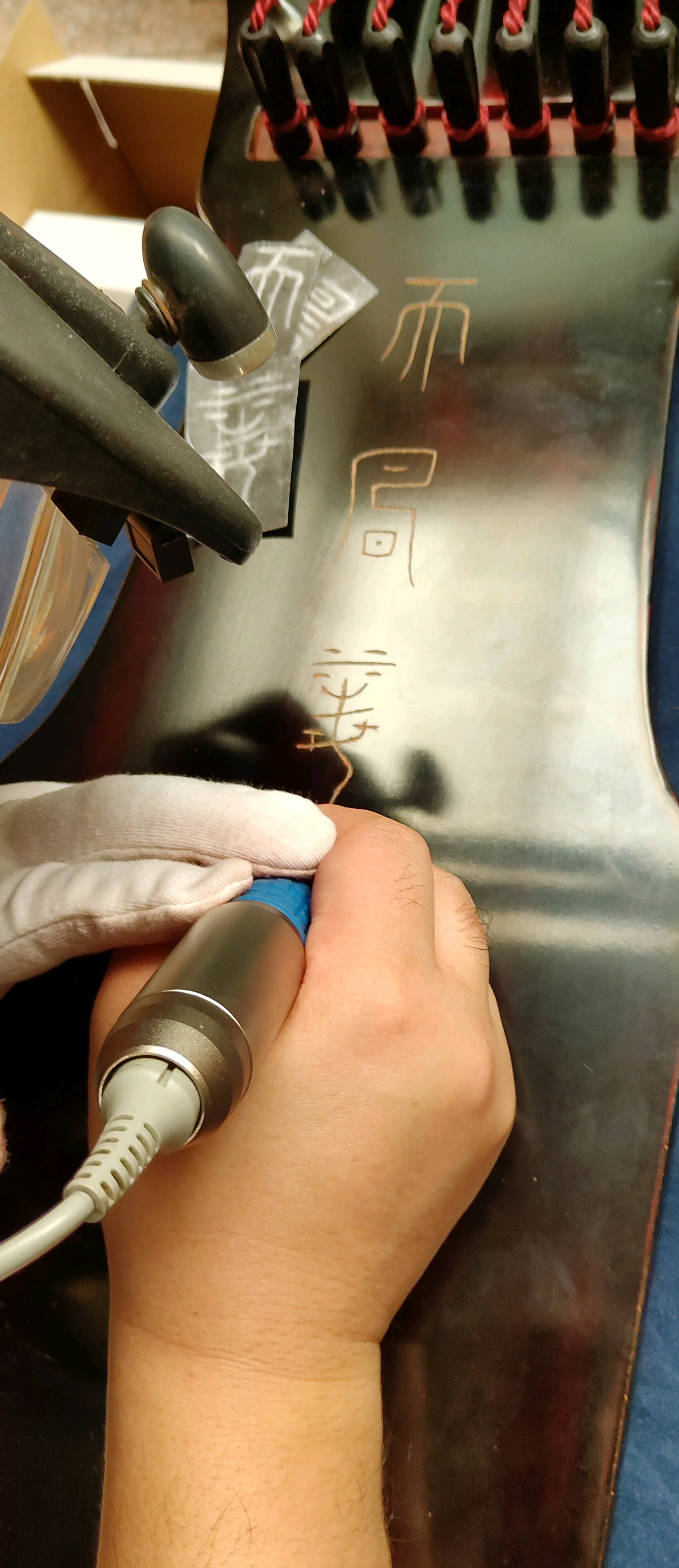 对了,我同事会雕刻,但是那打印字只做参考,他是先用记号笔把字自己画琴上去的