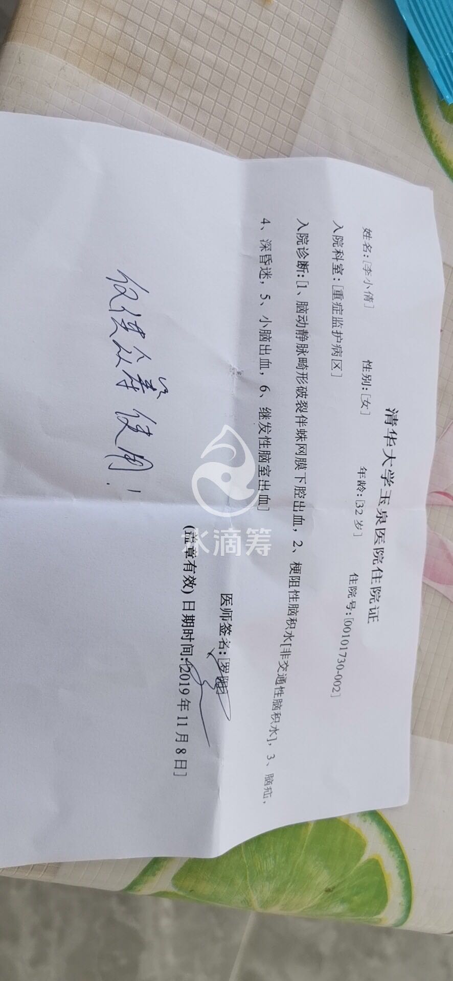 各位好心人你们好,患者叫李小倩,是我的妻子,本来幸福和睦得家庭被这场突如其来的病给扰乱了,10月25日早晨突然晕倒,我急忙给送到医院经检查属于脑出血,紧随其后就重昏迷了,医院马上安排手术,目前已经术后20天了依然在ICU重度昏迷,目前手术加上住院已经花了将近50万元,ICU一天就花1万多,后续恢复还不知要花多少钱,我个人的能力实在有限,我们还有一个快五岁的儿子,孩子很懂事,知道以后一直没闹过找妈妈,我实在是没有办法了,孩子不能没有妈妈,这个家庭也需要他,请社会各界好心人士帮帮我们这个家吧。好人有好报恳请各位好心人士伸手相助,多多转发,您的每一次转发对我们都至关重要,每一次转发对我们来说都是莫大的帮助!