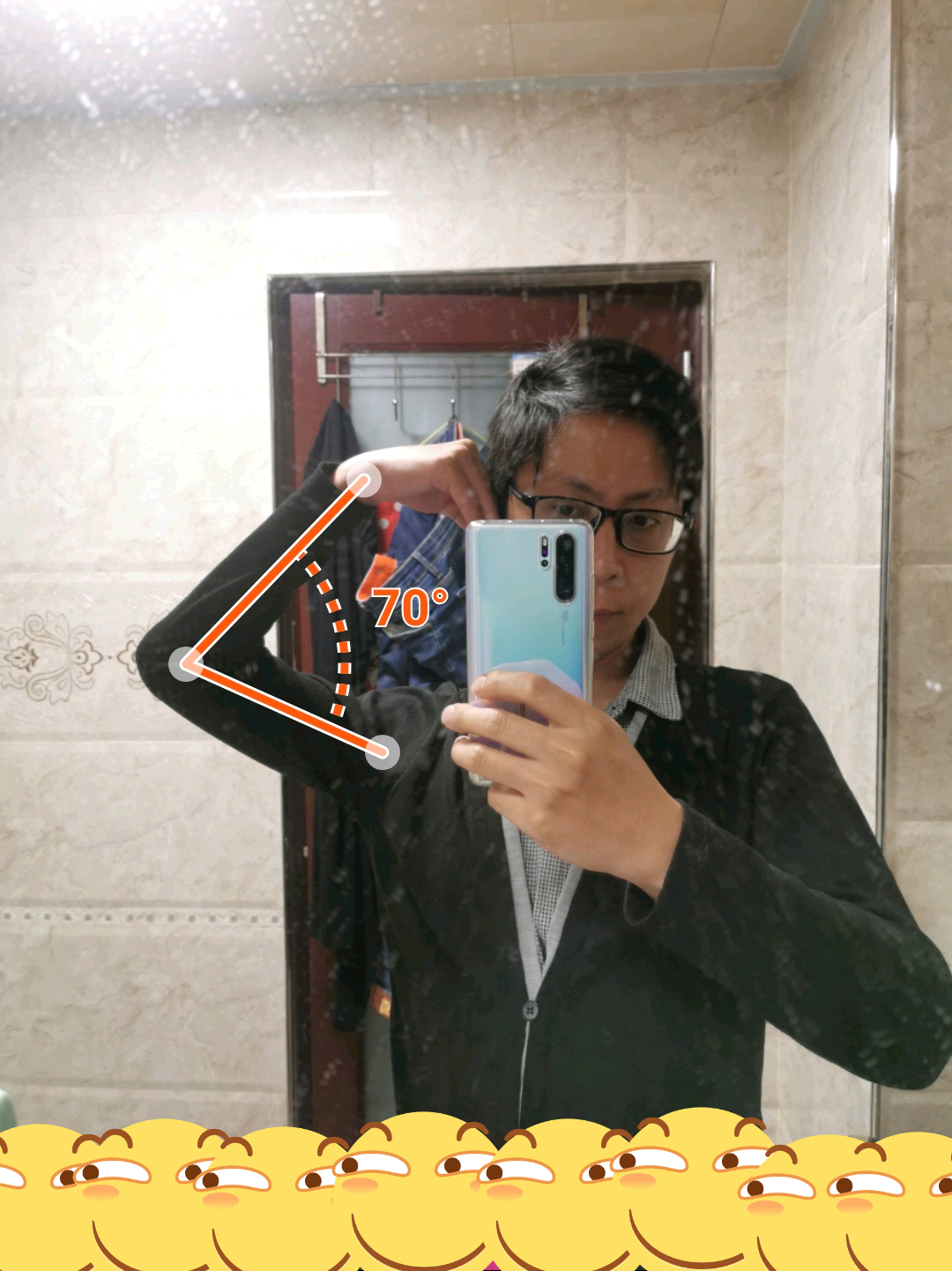 11月14日。没有量角度,晚上锻炼完洗澡的时候,惊喜地发现手能摸到头了,虽然不是摸得很贴,但也让我开心了很久,对康复充满了希望!