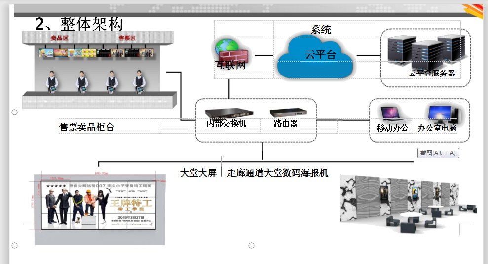 影城电子海报播控系统方案分为3个区域:售票卖品柜台、大堂拼接大屏、大堂数码海报机,分别在丌同区域安装丌同款式电子海报终端,整体采用云平台架构,最终完成影讯排期、卖品信息、宣传片花、商业广告等素材的播控,从而提高影院档次,让影院达到劢静结合的效果