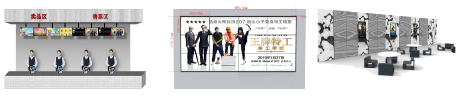 LCD液晶屏采用直线连屏方式,根据整体尺寸及售票柜台POSS机位,设计采用8台50寸窄边电子海报屏吊挂安装,屏体向下倾斜20度角,其中4台用于卖品信息显示,4台用于售票区(2台显示排期,2台播放片花素材)。播放内容可自由调整,多台设备可做同步播放。