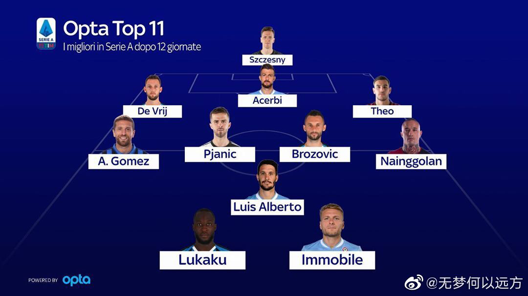 opta评选出的意甲十二轮后的top11,国米德弗里,网红和憨憨中轴线入选。
