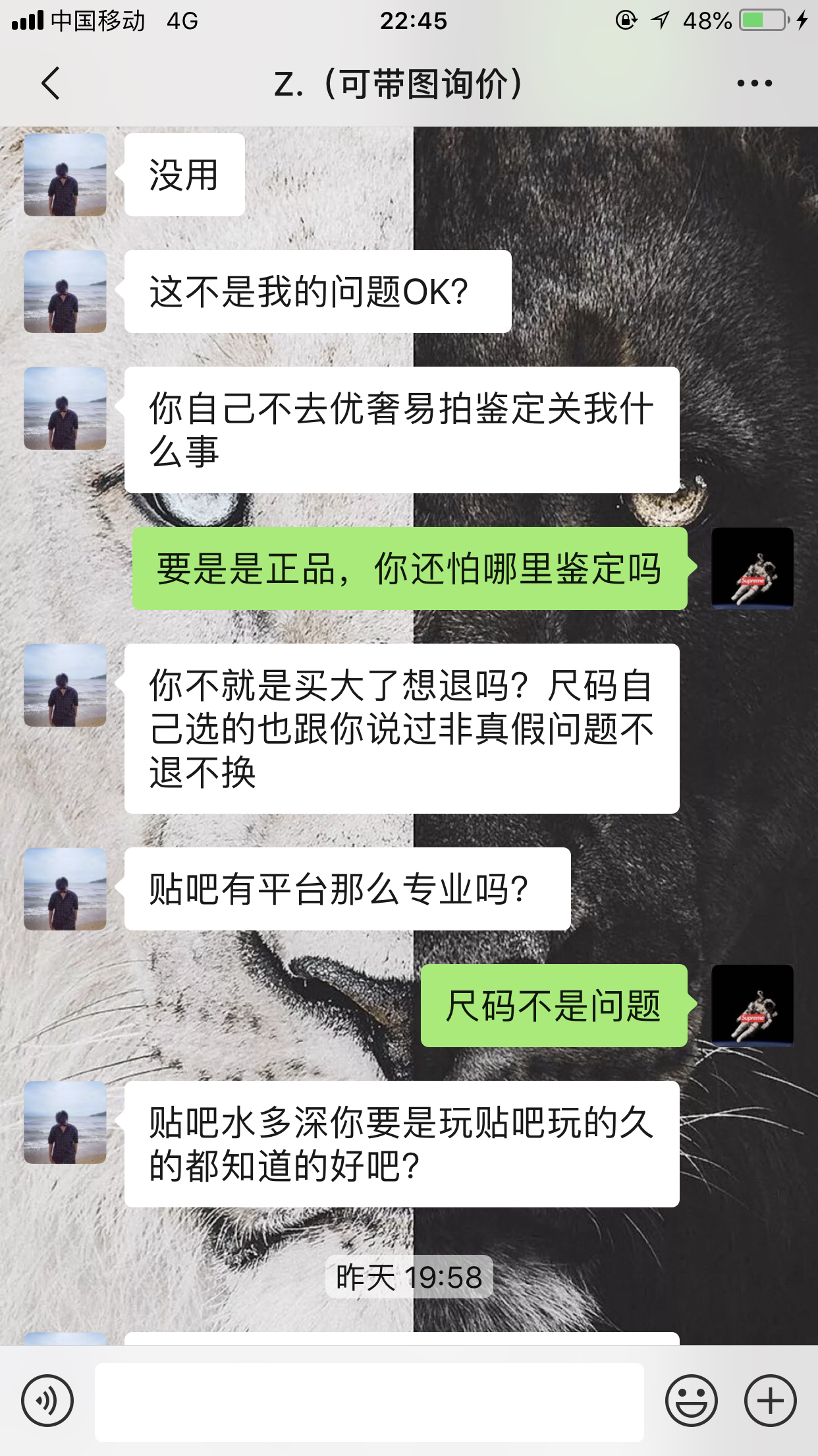 在拍下之前就跟你说过不支持贴吧鉴定你同意了我才给你发的好吧?现在又来逼逼赖赖?聊天记录谁没有呢?