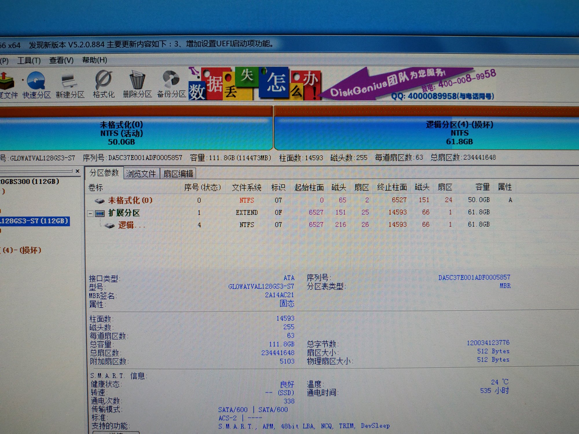 我有块盘就没用过几次就坏了,BIOS认盘,系统鲁大师看500+小时,不能分区不能格式化当系统盘进不去,分区助手提示损坏,请问还能保修吗,保修电话是多少