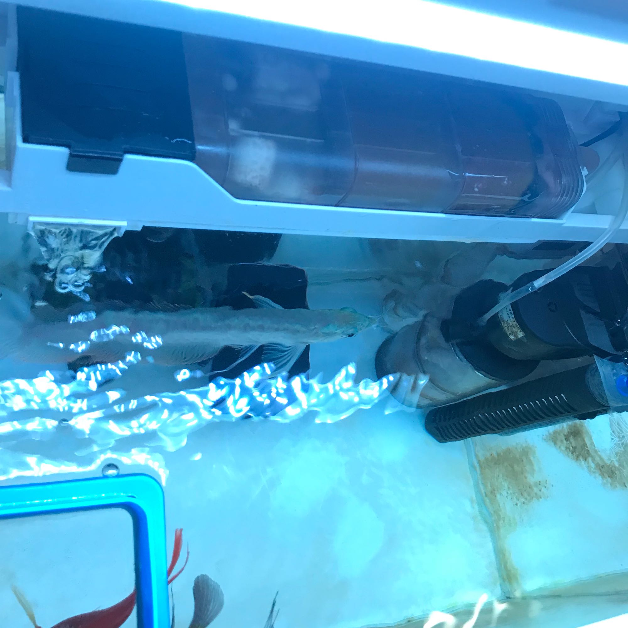 过滤系统一般,养这种大型鱼一般底滤或者滴流盒比较好。。。。。再一个你这长褐藻一般是光照有点多,你可以放里面几个螺,或者清道夫啃藻