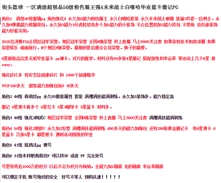 街头篮球 一区满级超极品50级粉色猫王强4未来战士白嘻哈毕业蓝卡徽记PG
