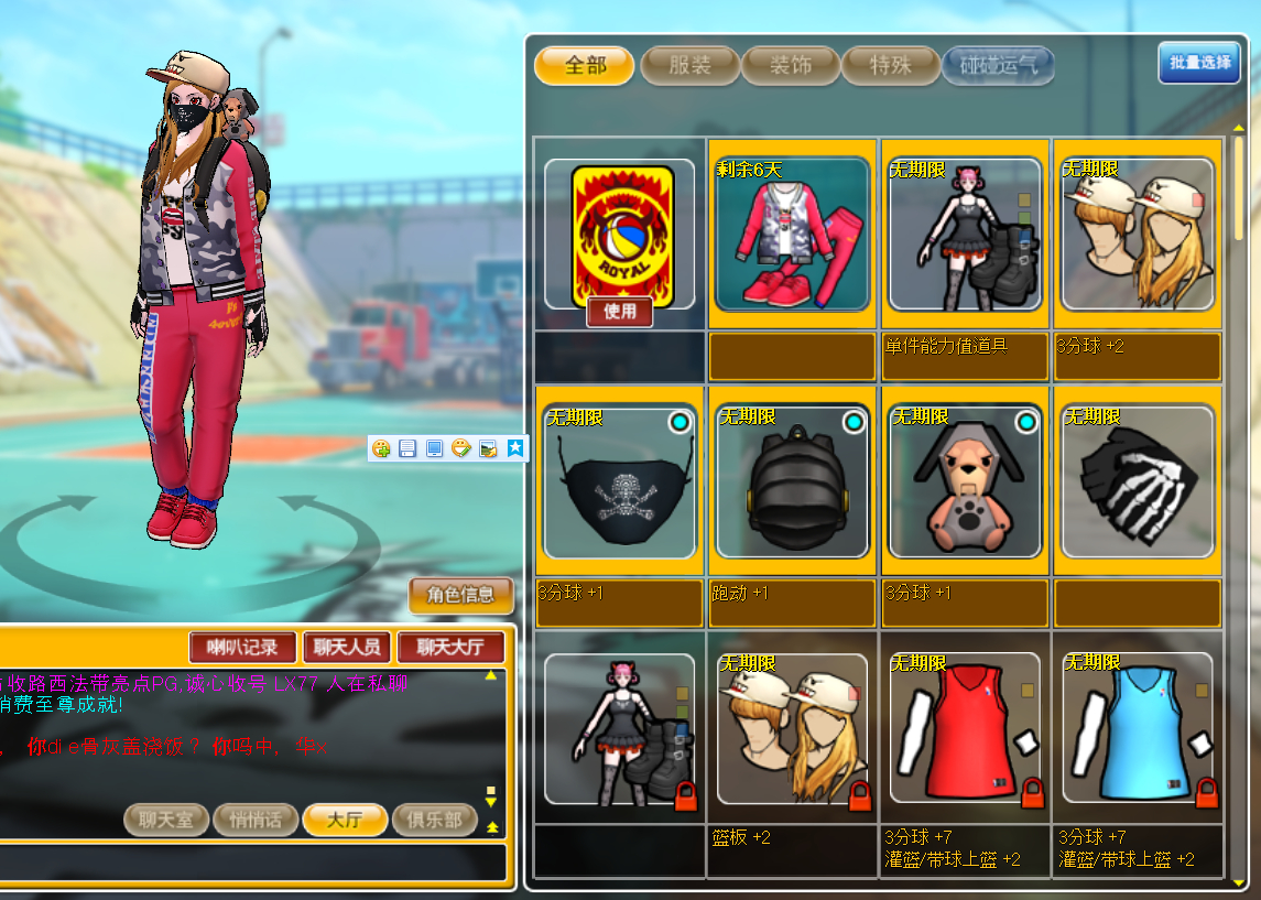 角色1 满级50级蜜橘pg 角色强化4 永久加2能力粉色猫王 永久白嘻哈套装 永久未来战士眼镜 **3件套一应俱全。永久