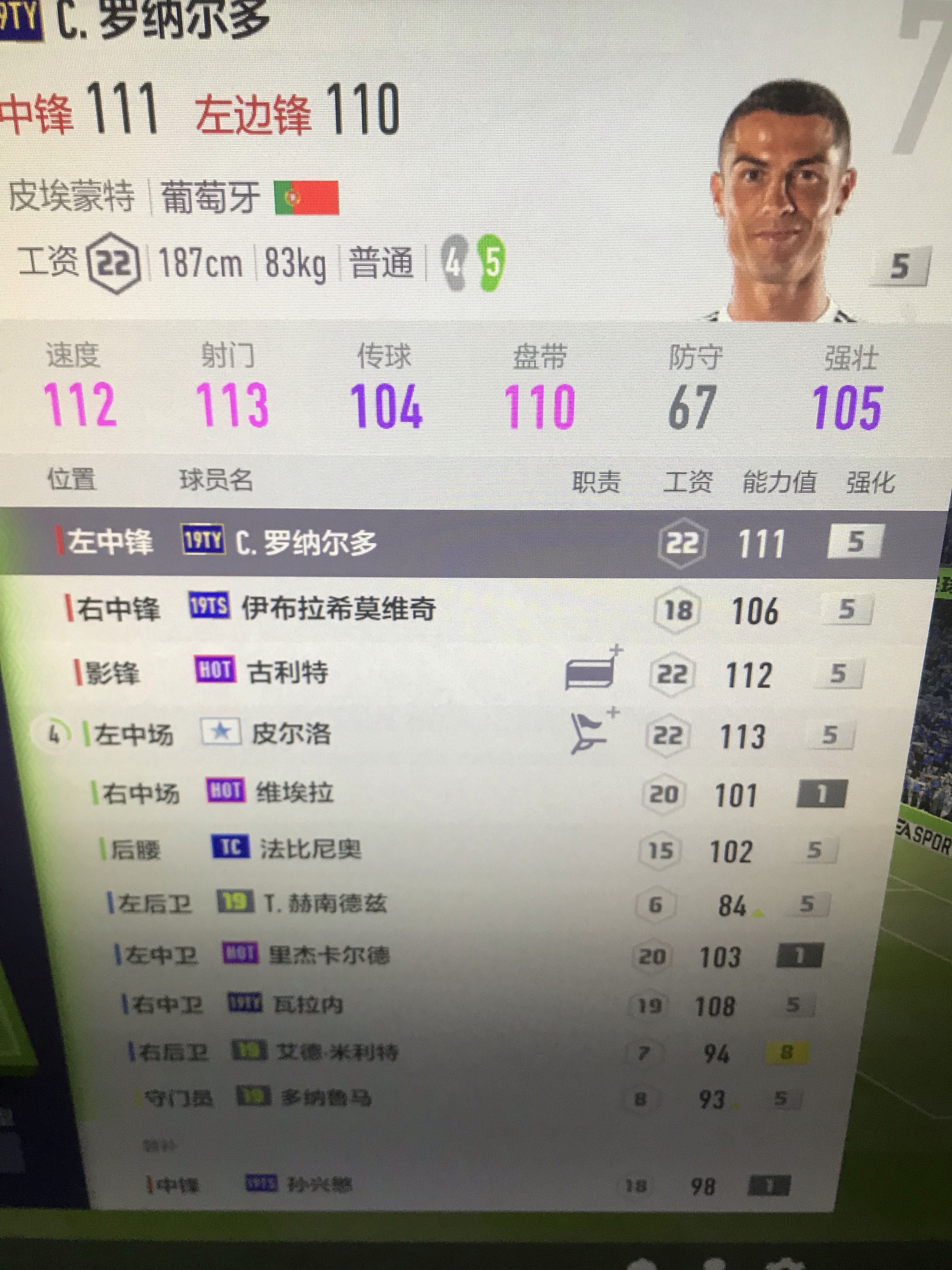 从想买到稳定首发,现在已经在为他挪用其它位置的工资了。当然如果全型,需要远射的话还是推荐TT7卡,(18工资)数据基本相同,但进攻我更喜欢HOT,还有HOT大罗不用说了,无敌,HOT维埃拉因为设置成了后腰所以防守感觉比TT更积极了(TT是中场)所以喜欢维埃拉插上远射的可以考虑TT,要是更偏重防守速度HOT必选